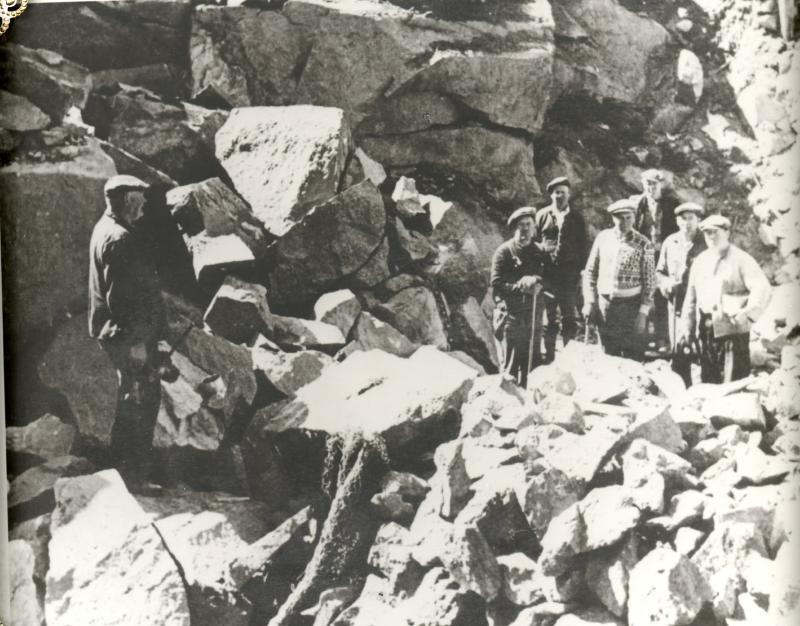 Karl Johansen med sine 6 sønner. : Arthur, Emil, Karl, Reidar, Ferdinand og Bjarne. Bildet er tatt på Nøsted Bruk i forbindelse med utbyggingen. Bjarne var skytebas. Karl kjørte lass med lånt hest fra Ingvald Meland på Gundesø. Emil f. 26.08.1899 , døde mai 1984.