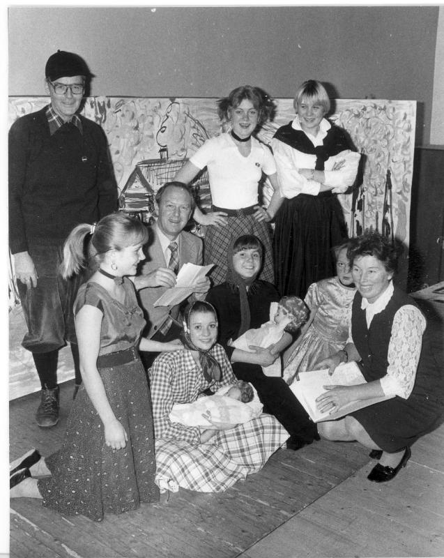 På 50 års jubileet i 1977 laget man revyen "Klokken er slagen" Tekst av Jan Bernhof Michelsen, sketsjene og visene av Goro Halden. Revyen var spunnet rundt handlinger i lokalmiljøet, og Helge Dammen ledet an blant aktørene på senen. På bildet til høyre sitter på huk Goro Halden. Mellom barna skimtes Jan Bernhof Micelsen. Bak stående : Bjørn Ask Henriksen som dro lagets historie på rim. Revyen samlet 3 fulle hus - 800 tilskuere i gymsalen på Konnerud Skole.