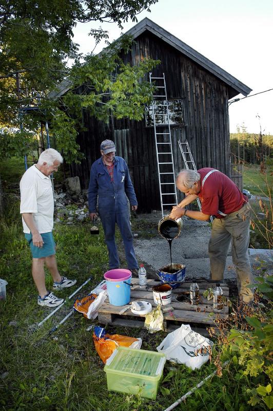 Tom Hayden og Hans Myhre kontrollerer at formannen i Historielaget, Ole Kristian Mortensen, blander beisen riktig.