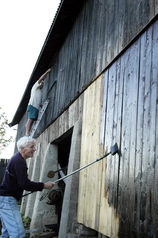 Primus motor for oppussingen, Reidar Halden svinger beiskosten i lav høyde mens "læregutten", Tom Hayden må klatre i stigen for å male vinduskarmene.