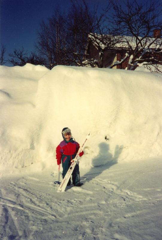 Bildet er tatt i Brokvollveien på Konnerud 1. juledag 1992. Bildet viser Eivind Solberg med nytt skiutstyr som han fikk julaften.