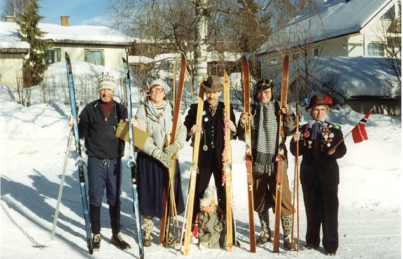 Skirenn i korets regi. Fra v.: Einar Borgan, Jorun Larsen, Jan Svere, Egil Larssen og Synnøve Furustad.