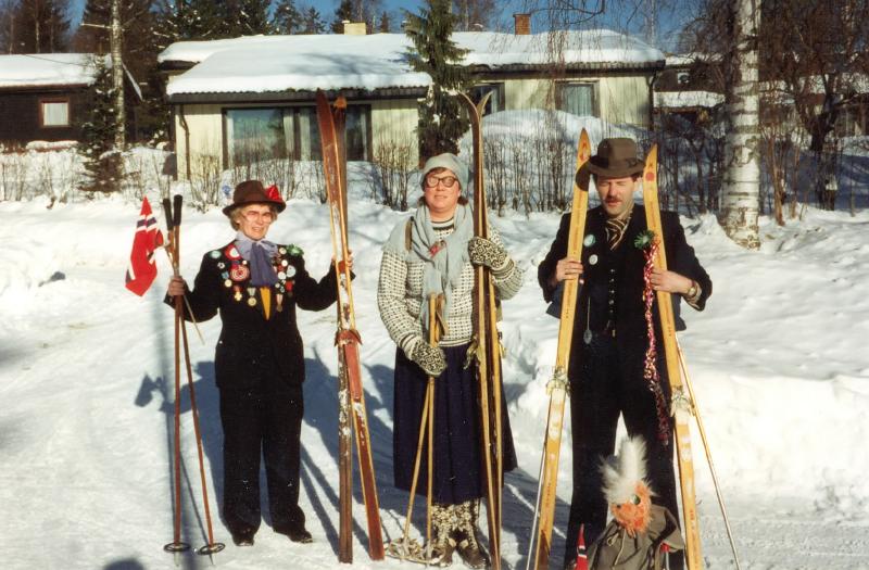 Fra venstre: Synnøve Furustad, Jorunn Stubberud Larsen, ukjent Skirenn fra Sanitetshuset ca 1965.