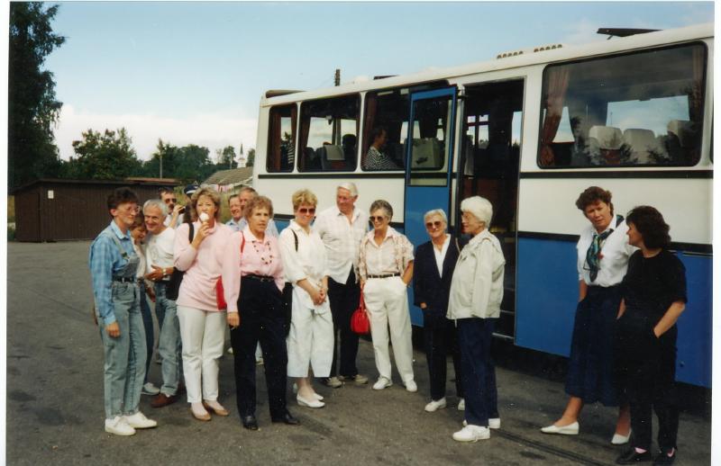 Konnerud sangkor på tur til Tuna Korsång på Røros. Fra v.: Torunn Ask Olsen, ?,Arild Ødegård, ?, Mona ?, Johnny Karlsen, Einar Borgan, Gerd Lund, Karin Eek Iversen, Per Hellerud, Eli Hellerud, kona til Egil Larssen, Arnlaug Ebbestad, Jorunn Larsen og Kirsten Tellnes Svere.