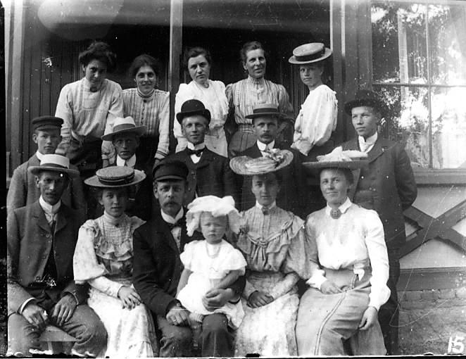 På Verandaen : Aagot, Gudrun Linseth, tanta Kaja, Thora, Hans, Kronstad, Isak, Bjerck, Aksel, Ingvald, Thora, Ivar, Helene, Maja og Elisabeth.