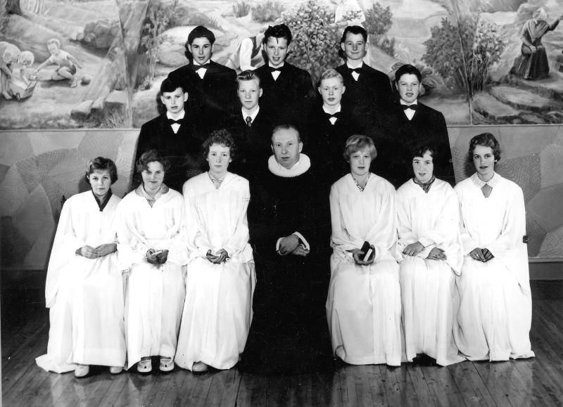 Konfirmasjonskull i 1956 Konnerud kirke. Det første kullet som hadde kapper. - blå og hvite Året etter hadde alle hvite kapper. Bak fra v.: Jan Nordli, Kjell Erik Johansen, Eigil Ringdal. Midten fra v.: Thor Løvold. Sven Skreosen, Bjørn Erik Halden, Per Runar Thoresen. Foran fra v.: Inger Lise Skjulstad, Åse Syvertsen, Randi Jensen, Pastor Jan Aas, Tone Brekke Nilsen, Else Marit Elmung (g.Land), Ragnhild Haveråen (g.Nossen)