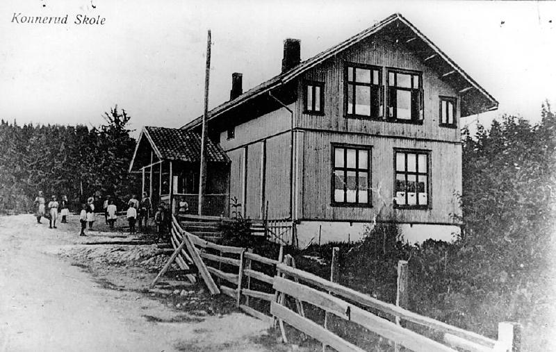 Skolen på Konnerud har en lang historie. Denne gamle skolen lå der den nåværende skolen ligger. Det var grev Wedel Jarlsbereg som fikk bygget den første skolen i 1746. Den ble tatt i bruk i 1747 slik at Konnerud skole i 1997 kunne markere 250-årsjubileum. Den opprinnelige skolen bestod av skolestue, kammer og kjøkken. Med årene forfalt den, men i 1839 ble den restaurert. I 1897, ble den påbygd slik at det ble plass til en lærerinne i tillegg til den faste læreren. Skolen var et lite gårdsbruk med en liten låve i tillegg til skolebygningen. Denne skolen brant i september 1933. Ny skole ble bygd og tatt i bruk i 1934. Se forøvrig tekst til bilde med Material-ID 1496 (søk på 1496).