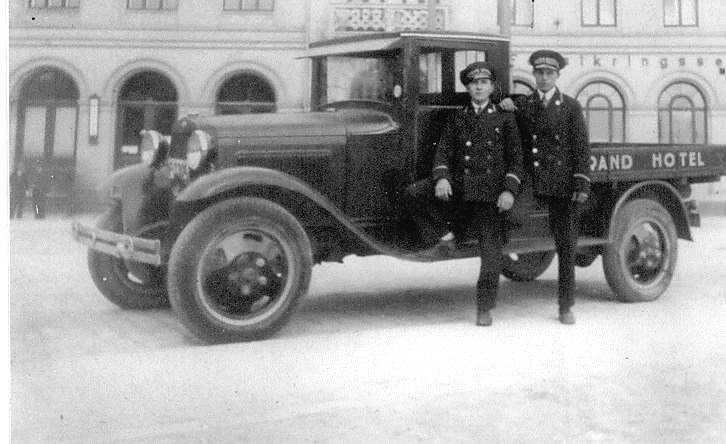 Til høyre . Johannes Jakobcen med firmabilen til Grand Hotel - en Ford AA 1930-31-modell.