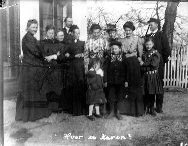 Utenfor Syormoen: Anna, Gina, Fru Clausen, Fru Kokkinn, Tante .meg, Aagot, Halvorsen, Agnes, Thorlif, Eva, og Kokkinn.