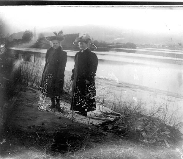 Frk Andresen og Jenny Broen ved Drammenselva. Langøya sees i bakgrunnen