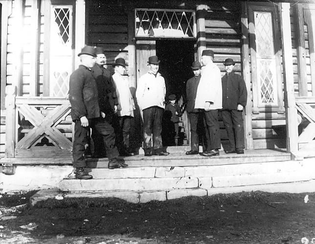 Fra skogbrukskurset på Kongsberg. Her i klær for å gå ned i grubene. Står foran Sakkerhuset i Saggrenda