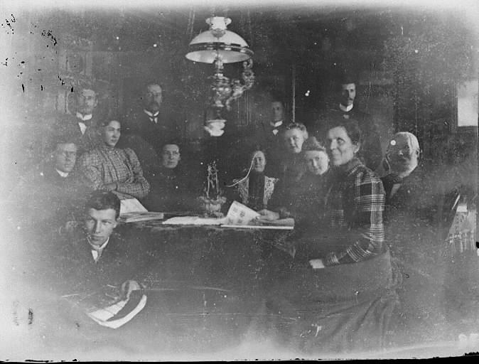 I Storstua på Stormoen: Hans, Ingvald, Aagot, Vigeland, Rickard, Maja, Gina, Svanhild Braathen, Margit, tante og far.