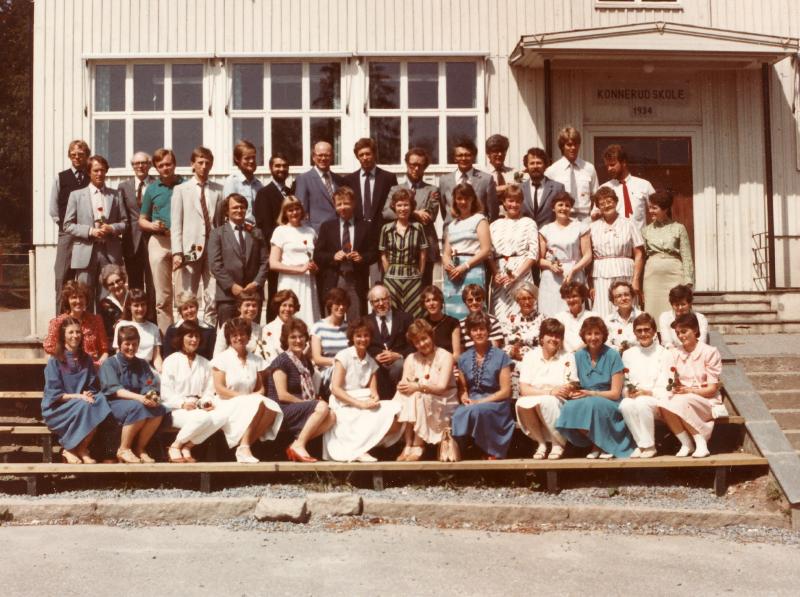Avslutning av skoleåret 1983 ved Konnerud Skole juni mnd. Alle lærere og kontordamer med rød rose flytter over til ny ungdomsskole - Svendsedammen på Konnerud. Frem til dags dato har Konnerud Skole vært 1-9 skole og nå blir den ren barneskole. 1.rekke f.v: Åse Arnslet, 2.rekke f.v: Bente Elisabeth Karlsen 3.rekke f.v: Edvind Sandsleth m/rose Jorid G. Sandsledt m/rose Sigrund Freng Ann Karin Scholden m/rose Marit Weel Anne Lise Alvik John Laukli ny rektor v/Svensedammen Julie Karin Hammer Gerd B. Michelsen Bente Bottegaard ? Grete B. Larsen m/rose Mary-Ann Pedersen m/rose Liv Myrseth Knudsen Inger Skurdal Tone Ultvedt-Moe m/rose Anna Hustad m/rose Ellen Oseland m/rose Reidun Evensen kontor v/Svensedammen Lita Jørnsen Arvid Nævra rektor v/Konnerud Eva Hafnor kontor v/Konnerud Liv Lyng m/rose Elisabeth Liverud m/rose Else Margrethe Hafredal Turid Willassen m/rose Åse H. Lyhmann Blixrud m/rose Toril Rygh m/rose Torunn H. Hustvedt m/rose Kari Haug Anbjørg Laukli Marit Nævra Else Kirkhorn 4.rekke f.v:Bjørn Andersen m/rose Henning Gaarder m/rose Dag Nordahl-Olsen m/rose Egil Myhre m/rose Sturle Salvesen m/rose Yngve Greni m/rose