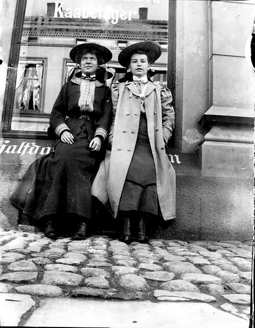 Linken Nilsen og Lilly Reiersen foran et butikkvindu i Storgt. Drammen