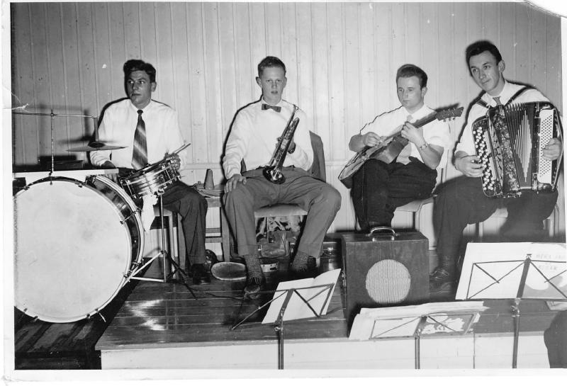 Underholdningsaften Konnerud Musikkorps på Folkets hus, Konnerud Fra v.: Erling Jacobsen. Per Tollefsen, Oddvar Warhuus. Kåre Gullhaugen