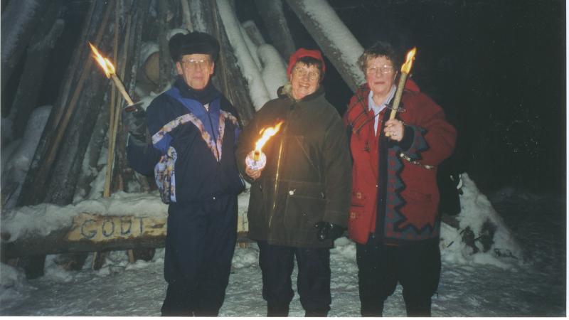 På Haukåsen nyttårtsaften. fra v.: Hans-Jørgen Hansen Steen, Ruth Hansen Steen og Reidunn Gullichsen. Konnerud Fellesorganisasjon stod bak arrangementet. Skaffet til veie fakler som folk kunne kjøpe. Stort fakkeltog fra Bernås til Haukås hver nyttårsaften