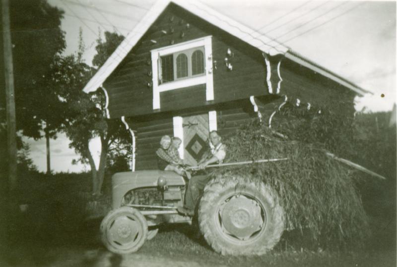 Graskjøring på Godthåp ca. 1954. Traktoren er en "Gråtass", Ferguson 1952 modell. Den første redskapen til gråtassen var gjerne ei lita kasse montert mellom trekkstengene. Denne var nyttig til mange slags transportoppdrag, også gras som da ble lesset helt inn mellom skjermene og mot traktorkroppen og setet. Traktorfører er Bjarne Steen med Inger Lise og Ingar på traktorpanseret.