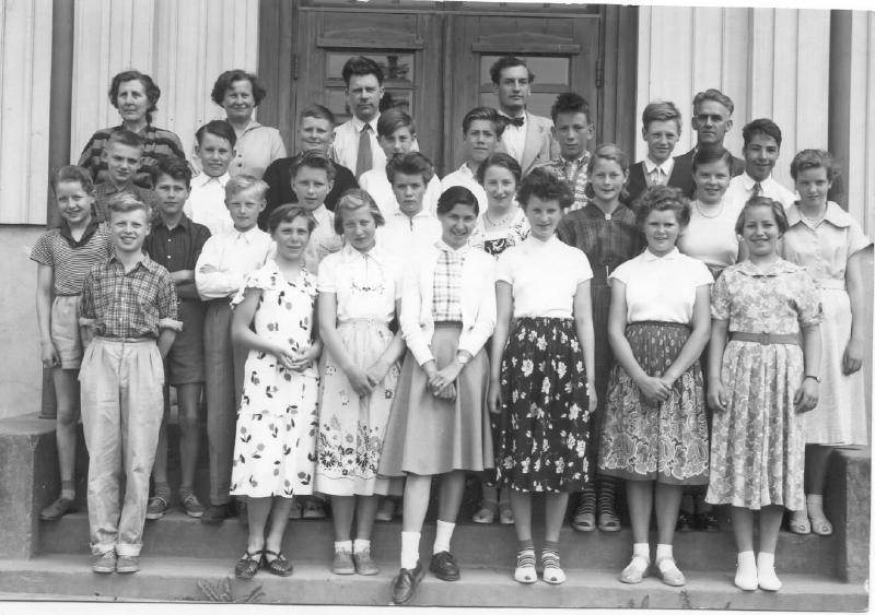 Klassebilde tatt på skoletrappa rundt 1953 ? Første rekke fra v. Kjell Dalbye . Turid Hybertsen. Liv Lillemoen .Narith Spier . Åse Thorud. Åse Pedersen. og Bjørg Wik. 2. rekke. Viktor Brudheim . Harald Andersen. Dag Pettersvold. Kjell Johannsen. Berit Blomholt. Jorun Skramstad Bjørg Skjellsbekk. Dagmar Halvorsen. Torunn Wisting 3. rekke. Leif Arild Nordal. Ole Kristian Mortensen. Hans Jørgen Wisting. Øystein Fagerhus. Jan Langebro Jan Eriksen. Erik Grinderud. Olaf Havereåen ( lærer). - Tore Langebro Bak: Lærerinne Anna Echoldt - Nelly Eek - Kristoffer Jahren - Torfinn Bø.