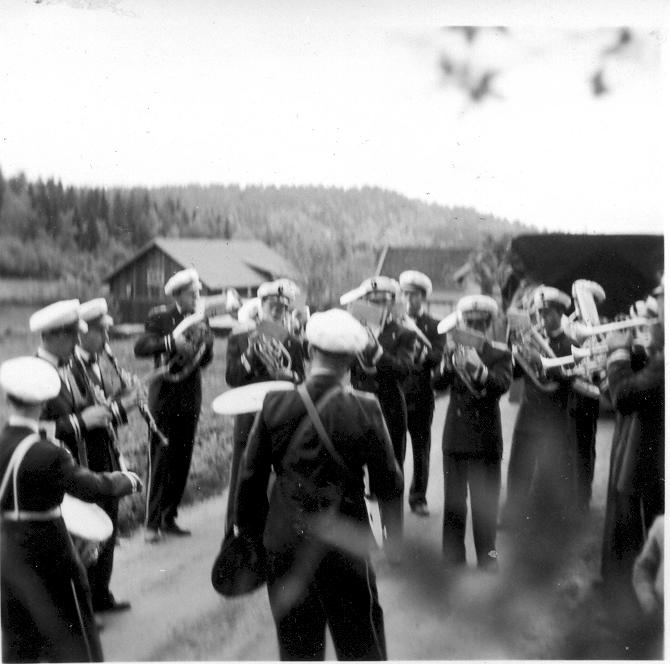 Musikorpset kom på en lastebil opp til Stubberud for å spille inn 17. mai. Nils Blixrud, Age Ravn- Hansen, Oddvar Warhus, Thorbjørn Tollefsen, Egil Kristensen, Finn Andresen, Kåre Gullhaugen, Helge Bliksrud og med ryggen til fotograffen : Egil Torgersen I bakgrunnen huset til Oscar Stubberud