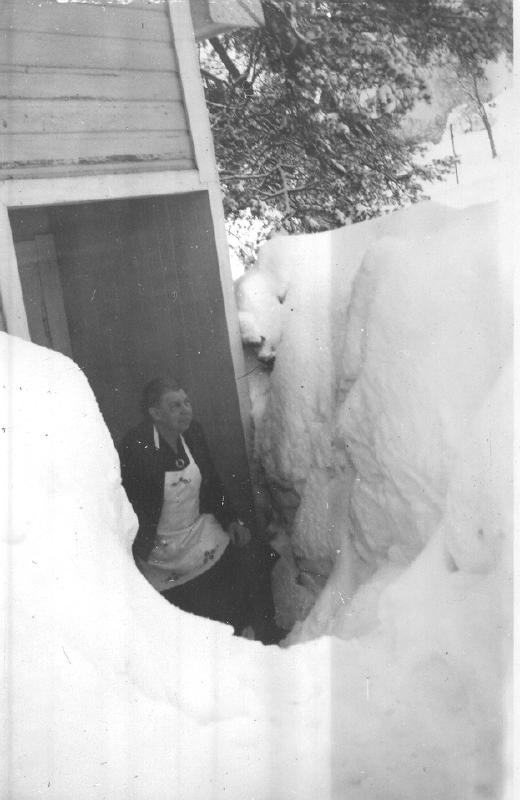 Hanna Hansen utenfor kjøkkendøra påsken 1951. Det er to trappetrin ned til bakken til vanlig.