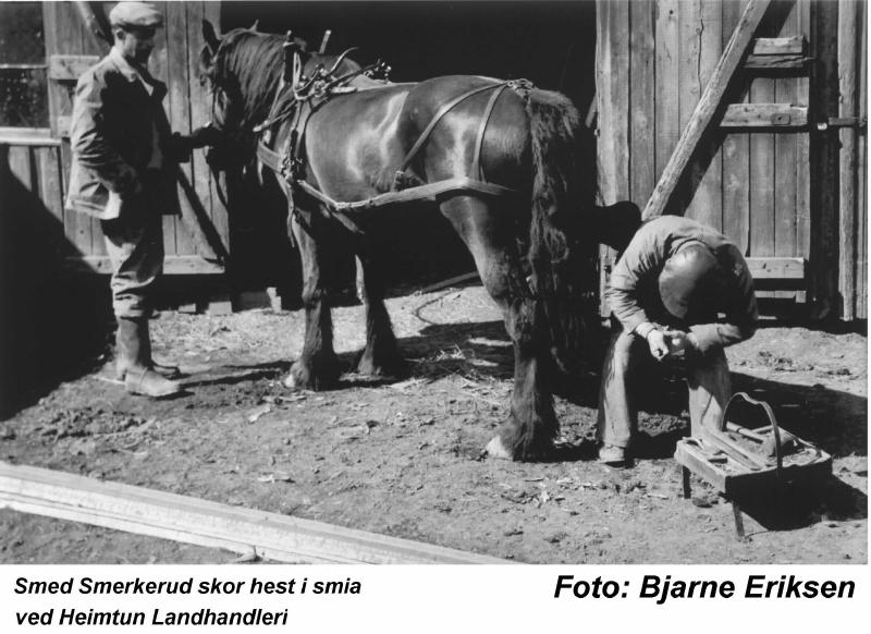 Smed Smerkerud skor hest ved Heimtun Landhandeleri Skoing av hest ved Heimtun (Fagerheim) i 1948. Smeden som holder hestens høyre bakfot mellom knærne mens han jobber med tilpasning av ny sko, er Olaus Smerkerud (1899 - 1977). Hvem som holder hesten, er vi usikre på. Smeden ble bestilt til gårdene, eller hesten ble tatt med til smeden, når det var nødvendig å få ordnet med hestens skoning. Bildet er tatt av Bjarne Eriksen som drev Heimtun Landhandel.