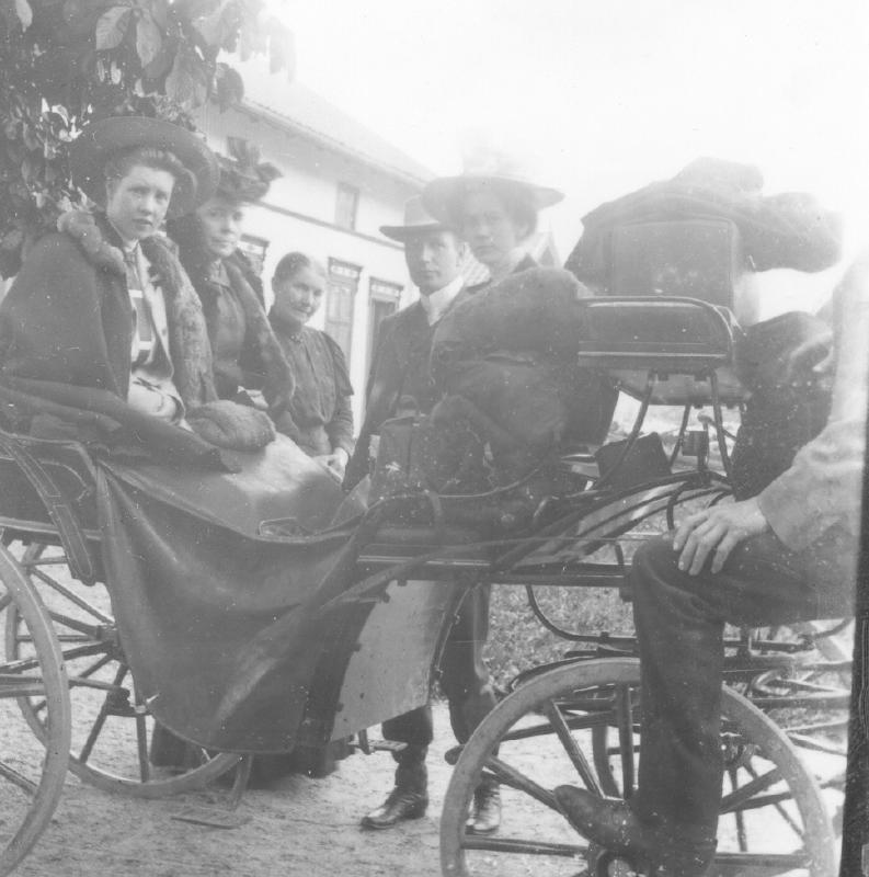 I trillen sitter : Fra v: Aja og prostinnen Høeg, Aagot og Hans Høeg. Stpende i midten fru Martine Bjerknes
