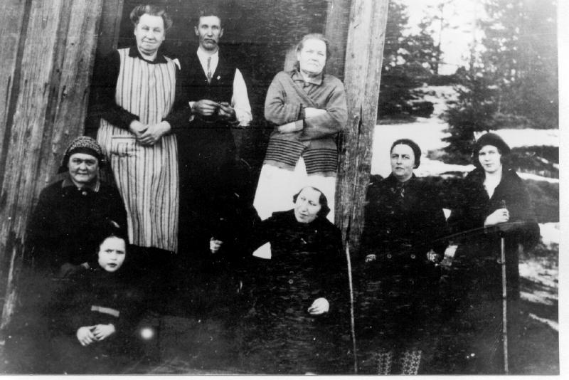 Fra v. Asta Hoff med datteren Gro, Rakel Lyche ( Fosserud) Ruth Nyrhagen, ukjent, Bak fra v. Mathilde Fosserud, August Gundersen, Anna Fosserud
