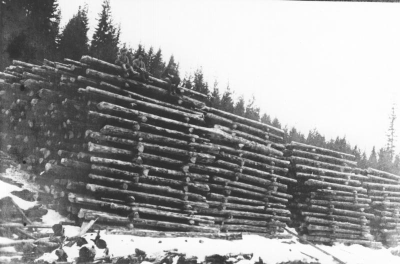 Tømmer klar til fløting ( Grodalsslaget ). PS. det sitter noen personer på toppen av tømmervelta.
