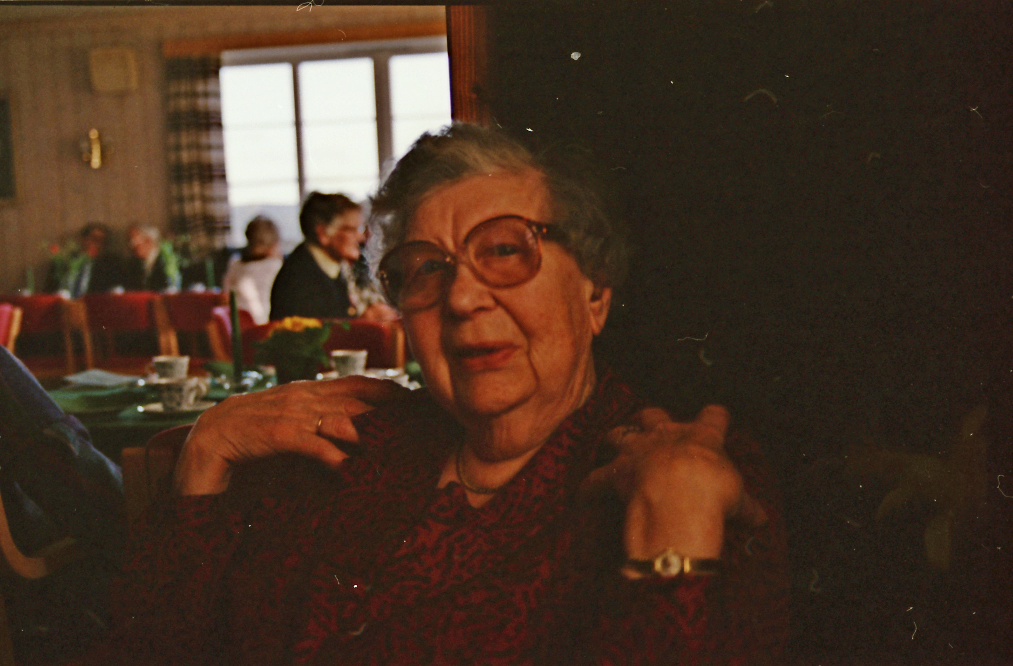 Bilde fra bygdebladet Skoger-nytts "Fem i Farta" i 1992, tatt på pensjonistforeningens møte. Tema var: Hvordan er det å bli pensjonist i Skoger? Intervjuobjekt: Marie Sundby Ekeberg.