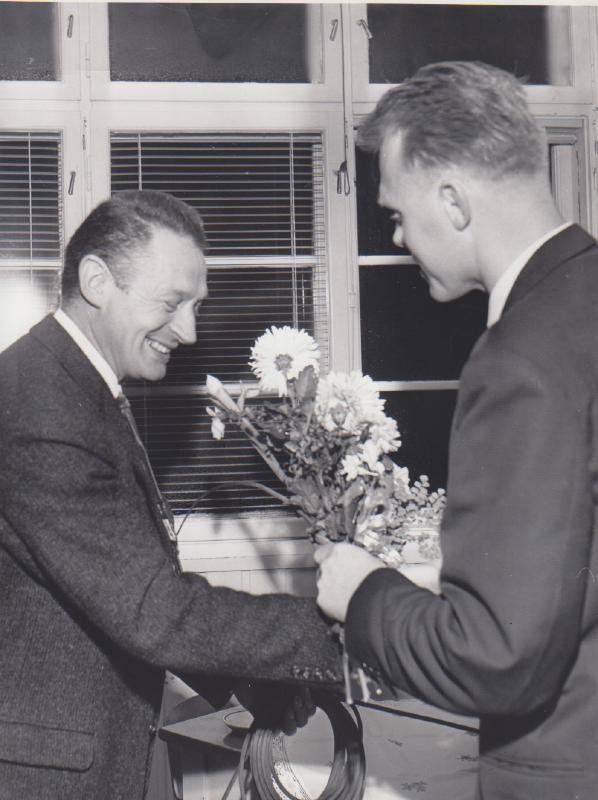 Den kjente skøyteløper "Hjallis" Hjalmar Andersen var på et arrangement på Speed-banen, og her får han blomster av Øivind Pedersen på Vestbygda skole.