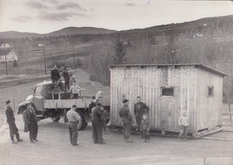 Bildet er tatt på "Smiutråkka" i Svingen Ei hytte ble flyttet fra militærdepoet på Jordbrækskogen til Speedbanen søndag 25. november 1956