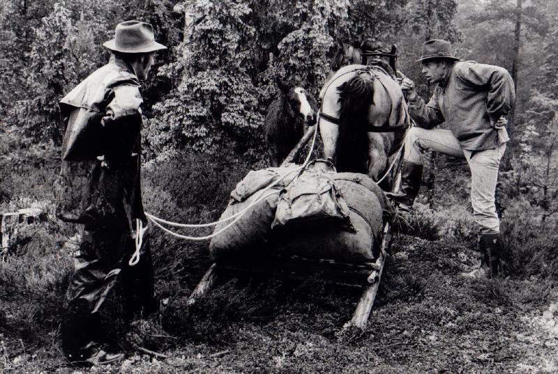Harald kjører sleip med travhesten "Glatina" 1980. Han skal ligge på skauen og hogge tømmer ei uke, På sleipet har han mat og klær for hele uka. Føllet Frk. Glatina er med Ole Karl stopper for en prat Tekst: Torill Juel
