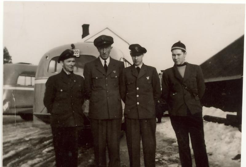 Snuplassen ved Konnerudkollen. Fra venstre: Henry Pedersen, Hågenstad?, Ivar Pettersvold og Tore Pedersen (konduktør). Bildet er tatt 1952-53?.