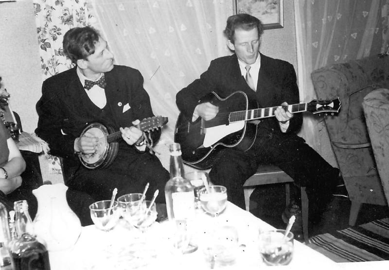 Oscar Stubberud f. 1903 har 50 års dag hjemmme på Stubberud og gode arbeidskollegar feirer dagen. Fra v.: R. Rypås, Bjørn Backmann