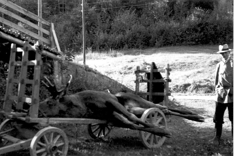 Tomas Løkka (1889-1971) inspiserer elgen v/ låvebrua Nedre Andorsrud