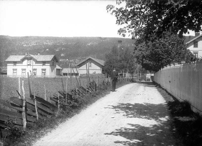 Glassplaten er skannet og behandlet av Fotohuset, Drammen. Til v. Strømsgodset Ungdomsforening`s lokaer. Rett fram, Rødskog gamle skole. Til Høyre konsul K. Myhres hus som fra 1914 ble pleiehjem.
