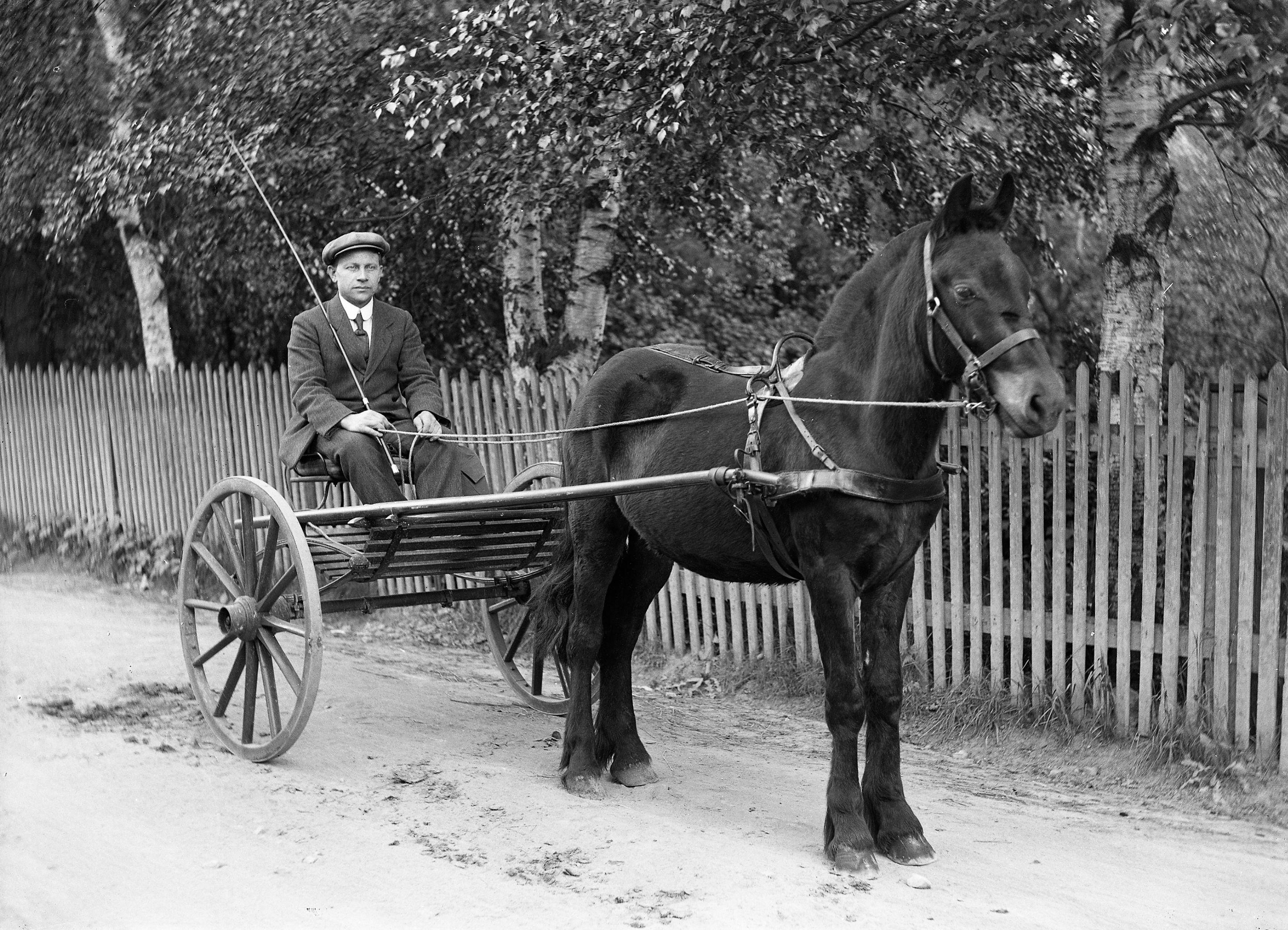 Glassplaten er skannet og behandlet av Fotohuset, Drammen. Hest med kusk utenfor Kopperud