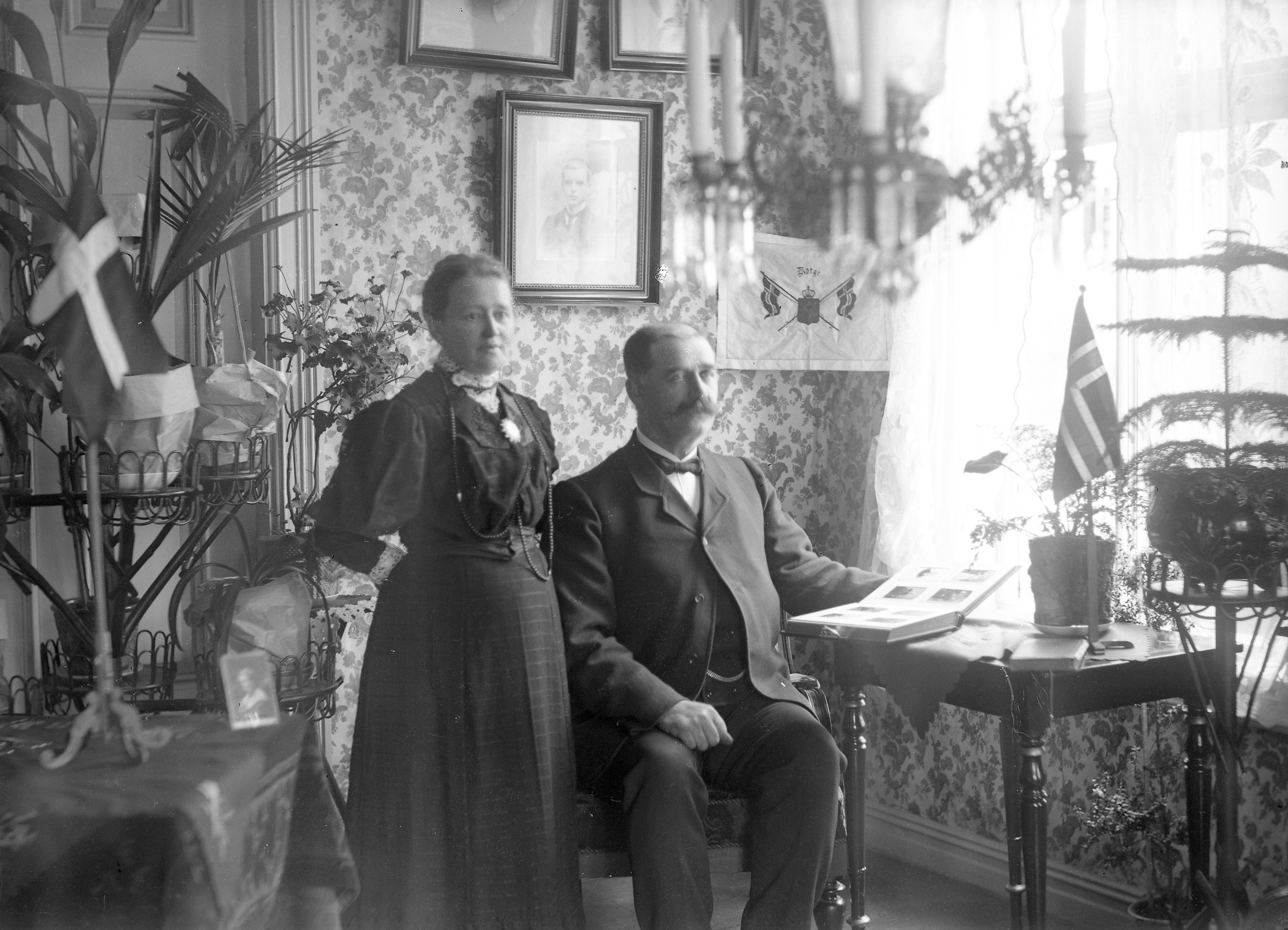 Glassplaten er skannet og behandlet av Fotohuset, Drammen. Lok.fører Andreas Nilsen Skarra, Langum f. 10.04.1859 Vestfossen d. 1935 på Langum Fru Julie Regine Sophie, f Clausen f. 13.09.1860, d 15.05.1945. Billedet er tatt i stuen på Langum. Bildet står i Skogerboka.