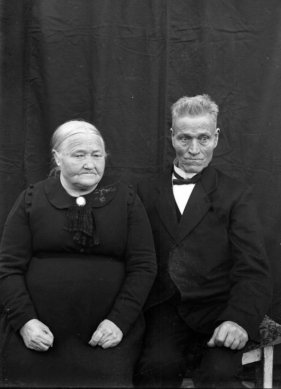 Glassplaten er skannet og behandlet av Fotohuset, Drammen. John Monsen Gram f. 1845 d. 1929 og hustru f. Hatleberg, fra Borgund i Sogn. De bodde først på Stensmyren i N. Eiker. I 1911 ljøpte de b.nr 3 av Langum, " Eriksbrøten ", som de solgte igjen i 1917. De hadde 7 barn.Ett av dem Ole Gram var kjøpmann i Rødgt 1. Fotograffens besteforeldre eide dette huset tidligere. Oles sønn Arthur drev som kjøpmann her i mange år. Huset bøe revet i 1980.og et nytt bygget i Rødgt. 1Bl. a. er barermester John Gram barnebarn av John Monsen Gram . De har mer etterslekt i Drammen, Oslo, Tønsberg, Konnerud