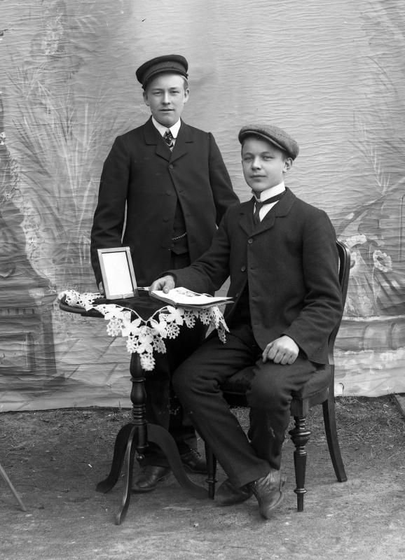 Glassplaten er skannet og behandlet av Fotohuset, Drammen. Reinhard Jørgensen sittende og Sigurd Gulbrandsen