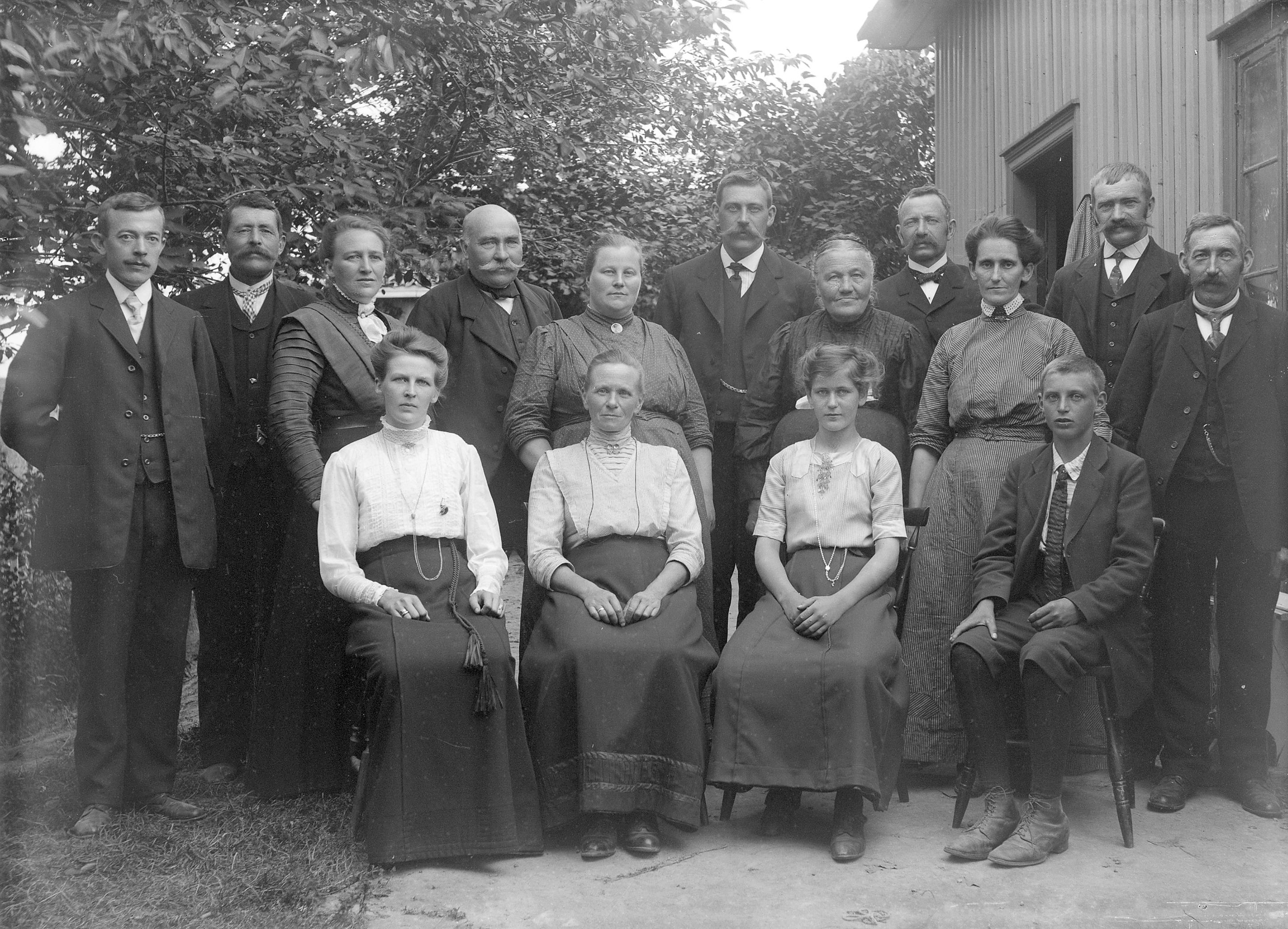 Glassplaten er skannet og behandlet av Fotohuset, Drammen. Johan Johannessen nr. 4 fra venstre bak, hans kone nr 7 fra venstre bak.