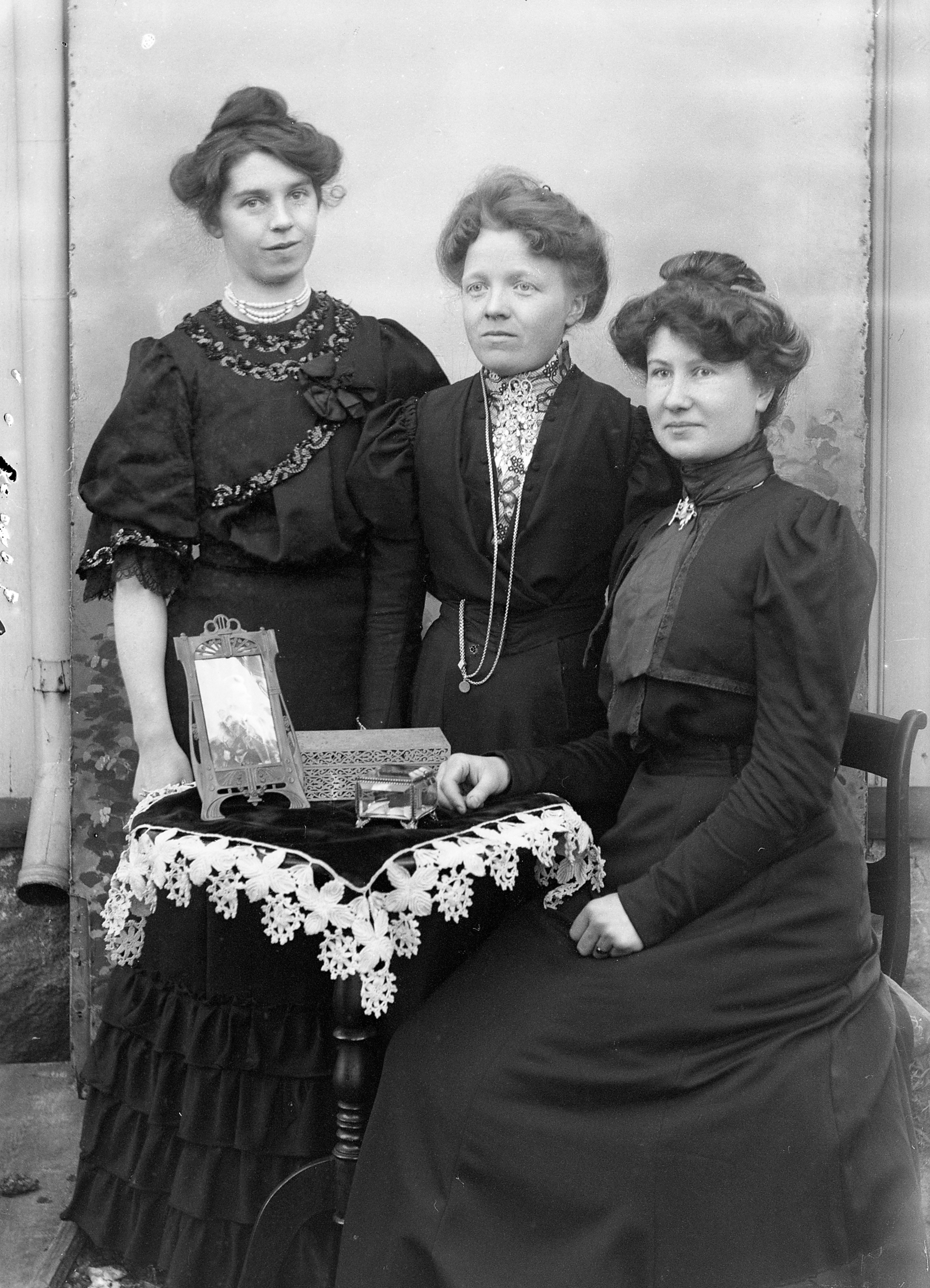 Glassplaten er skannet og behandlet av Fotohuset, Drammen. Lina Larsen i midten
