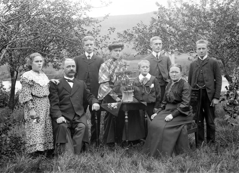 Glassplaten er skannet og behandlet av Fotohuset, Drammen. Anders Skarra og hans familie. Fra v.:1.Thea Kristine f. 1892, g.m. Gunnar Sundal 6 barn 2.Lok.fører og gardbruker Andreas Nilsen Skarra , f.1859 3. Olaf Langum f. 1887, ing. g.m. Elfirida Engh. 5 barn 4. Anna, f.1884, g.m. Carl Bernard Rosenberg, Oslo. 3 barn 5. Sverre Nilsen f. 1896. Dipl.ing. NSB g.m. Agnes Sørensen. 1 barn 6. Kristian Langum, f. 1886, g.m. Margit Nilsen. Ingen barn. 7. Regine Sofie Clausen, fru Nilsen, f på Hoen i Eiker 1860. 6 barn 8. Johan Langum f. 1889, g.m. Magda Skjelsbek, Ingen barn