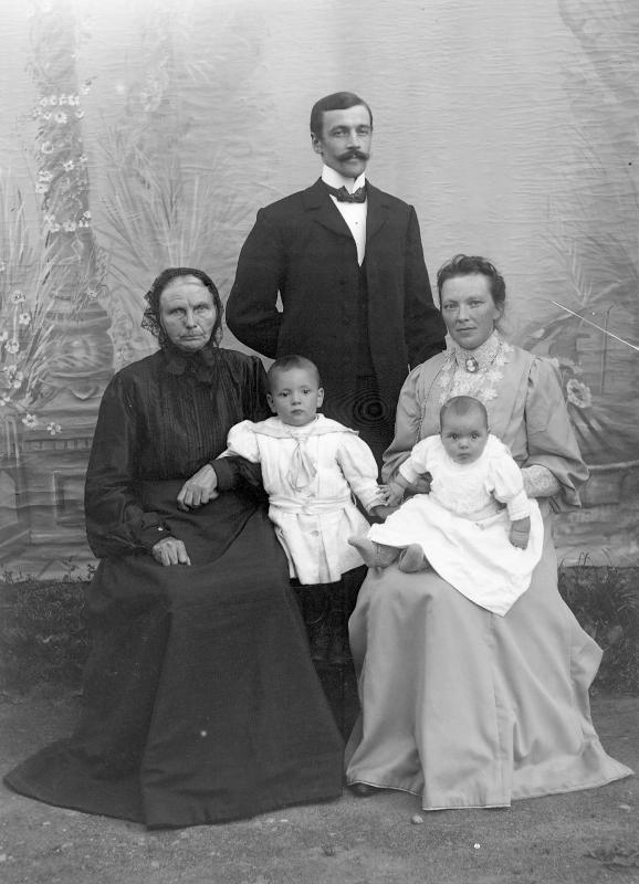 Glassplaten er skannet og behandlet av Fotohuset, Drammen. Hans kone Bertha Nilsen med Astrid på fanget. Olaf Nilsen sitter på bestemors fang. OLAF NILSEN DREV GRAMSBORG LANDHANDLERI