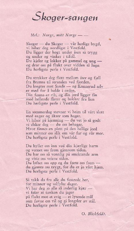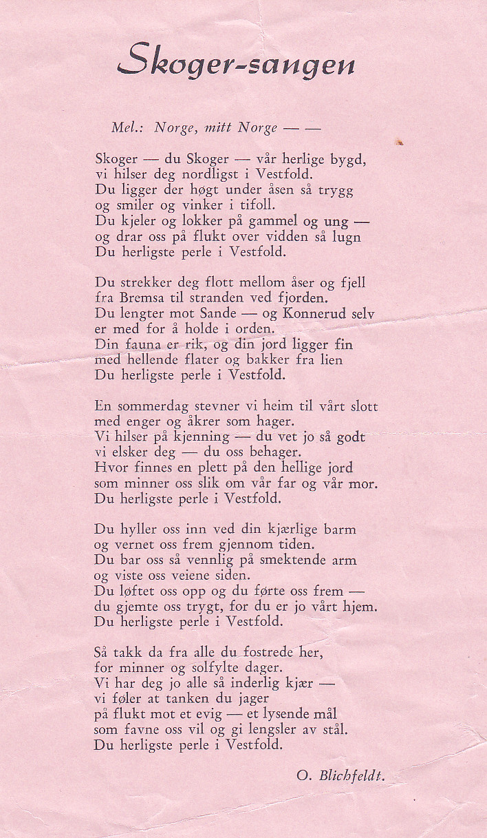 Under 2. verdenskrig skrev lærer Blichfeldt den første « Skogersangen » i anledning av Skoger ungdomslag's 50-års jubileum. Sangen ble urframført 6. juni 1942 av Skoger sangforening. Under Alternative filer ligger et opptak av "Den Gamle Skogersangen", sunget av Hans Steen. Dette er en annen sang enn teksten her av O. Blichfeldt. Vi ønsker tilbakemeldinger hvis noen kjenner mer til opphavet til denne sangen. Send melding til foto@skhist.no. Klikk på "Last ned" og åpne den nedlasta fila for å høre sangen.