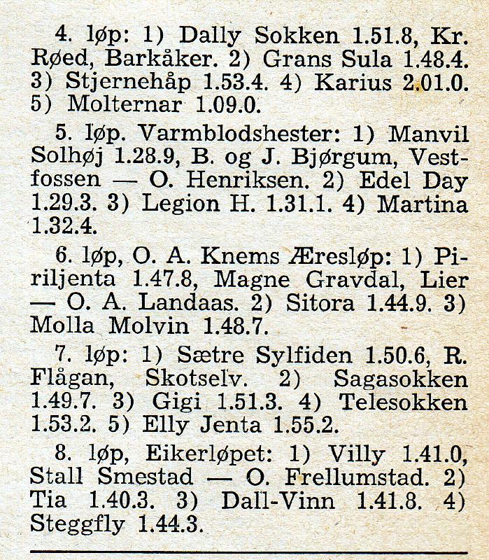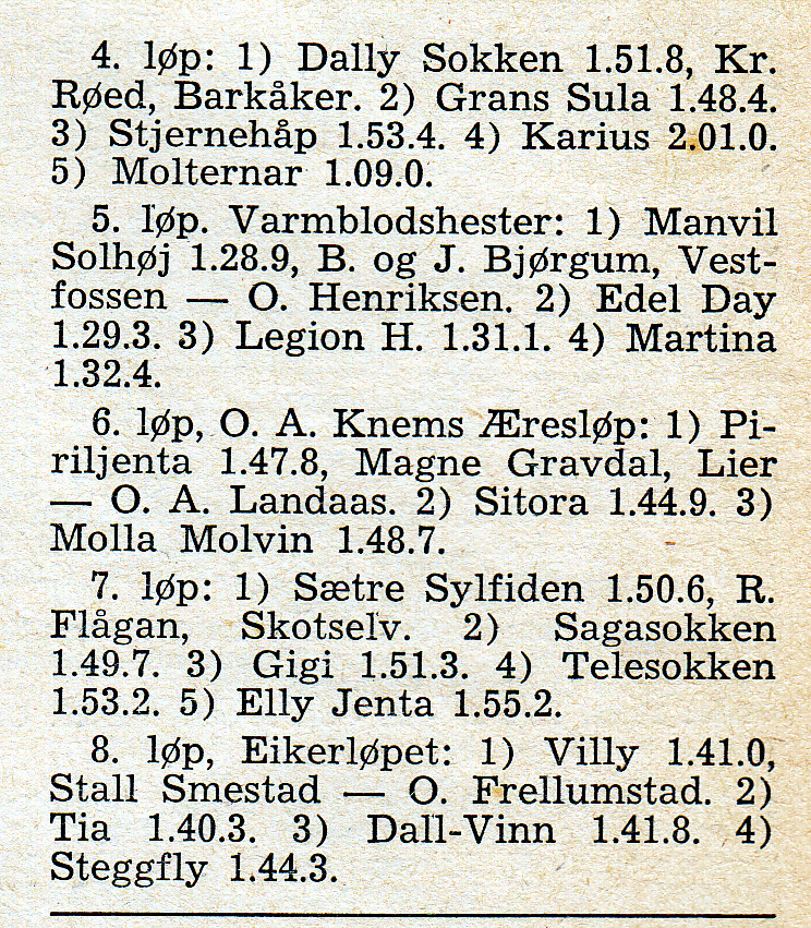 Eikerløpet 1974, vinner Tordenstegg, eier Thorbjørn Finsrud, kusk Arne Finsrud. Steggfly på 2. plass