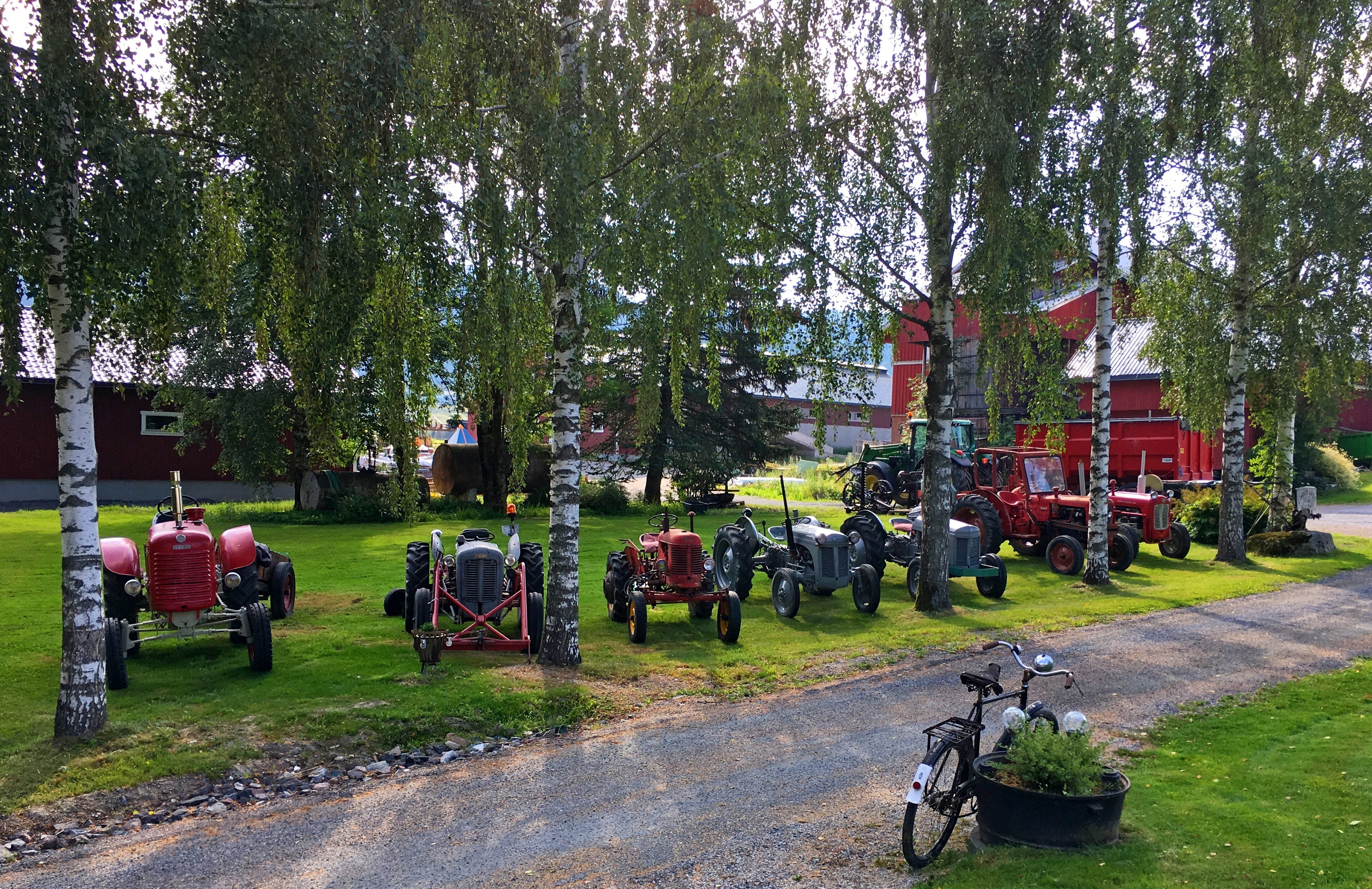 Hans Jørgen har satt ut veterantraktorene for sommeren. Når det er plenklipping må må de flyttes, så da er det fint at alle starter. Sykkelen er selvsagt også ute en tur. Steyr 1956, Massey Ferguson Gullfisk 1956, Massey Harris Ponny 1958, Ferguson Gråtass 1951, Ferguson Massey Harris Gråtass 1955, Volvo BM400 1966, MF 35 1960