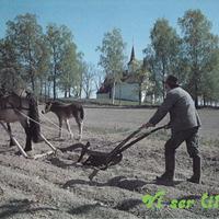 Markus Johnsrud, historielagets første formann, pløyer ved Skoger gamle kirke. Foto brukt som omslagsbilde på historielagets 5-årsberetning. Bildet er sannsynligvis tatt ca 1979.
