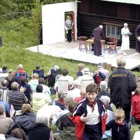 Vestskogjegernes minnedag inne ved bautaen arrangeres den siste helga i mai hvert år i regi av HV. Historielaget er med som arrangør i forbindelse med Vestskogdagen på Rønnehue som avikles samme søndag. Bilde er fra minnehøytid ved bautan i 2006 der politimester Christine Fossen var hovedtaler. Ni av veteranene anført av Arne Jorbræk ( holder flagget) deltok. Flagget er forøvrig det samme som gutta på skauen benyttet så lenge leiren i Vitamindalen eksisterte - fram til freden i mai 1945. Til høyre tidligere forstmester i Selvik Bruk, Sverre Skurdal. Fra venstre på bildet ser vi: ukjent, ukjent, Christine Fossen, Gunnar Båsen (bak), Bjørn Åby (bak, forfatter av "Vestskogjegerne"), ukjent (foran), Nils Berg, Sverre Skurdal, Arne Jorbræk